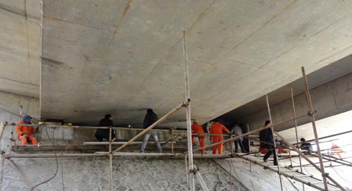 首先我司工作人員對鎮(zhèn)江路段橋梁的跨距、每跨的梁片數(shù)、梁片的結(jié)構(gòu)形式以及橋梁的高度進(jìn)行現(xiàn)場現(xiàn)場勘察。并查看相關(guān)圖紙核實橋梁縱向連續(xù)梁片數(shù),從而初步計算出梁體重量及荷載能力。然后經(jīng)過測量梁片與墩臺之間的實際距離,研究放置千斤頂?shù)奈恢眉芭R時支撐位置。討論現(xiàn)場施工操作人員、觀察人員的位置以及整個施工環(huán)境。