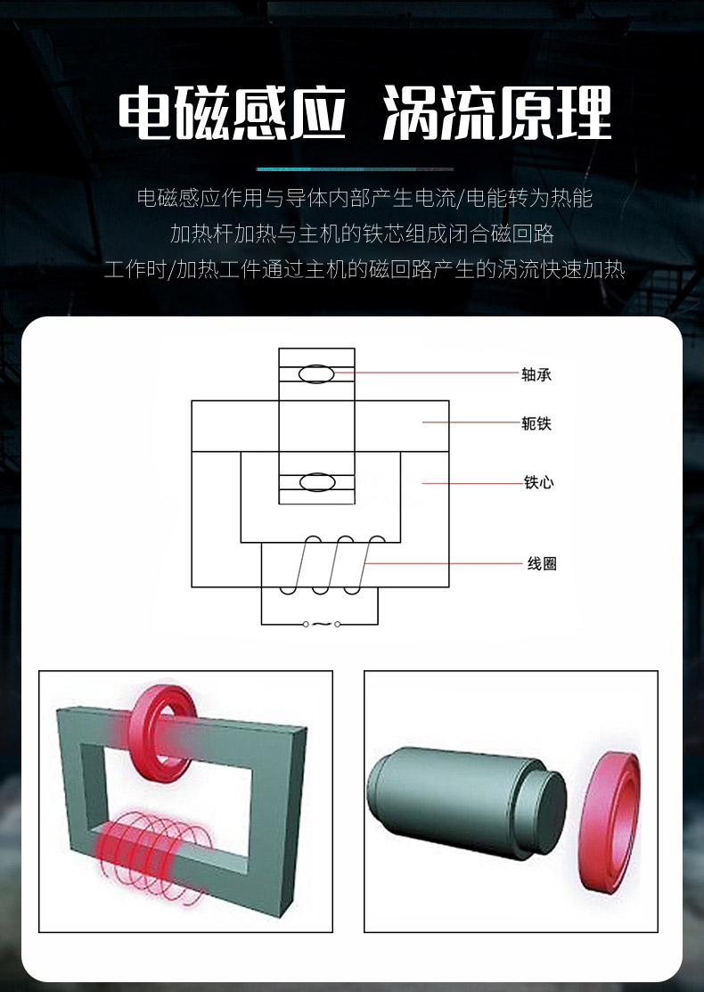4、被加熱工件放置到主機(jī)鐵蕊中間活動軛鐵的下面,輕輕向下移動,使之與工件吻合(若工件厚度尺寸不變,可調(diào)節(jié)主機(jī)后杠桿橋下面的定位螺釘,使軛鐵與工件保持2mm的間距,以方便連續(xù)操作)。至此,調(diào)試結(jié)束,可投入使用。